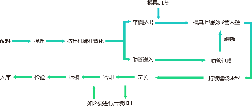 聚乙烯在主擠出機(1)聯合擠出機(2)中加熱熔化。聯合擠出機通過模具擠出形成一條黑色的板條,而主擠出機通過模具在支撐(4)管外形成一保護套管。板條通過纏繞形成管材的管壁,而支撐管及保護套管附于板條外壁形成管材外部結構。通過改變模具和生產程序,可生產出多種外形結構和壁厚的管材。